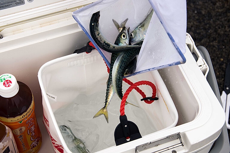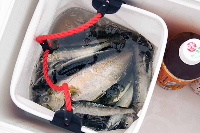 釣り上げた魚は元気がよいうちにこまめに海水氷に移して締めてしまう。