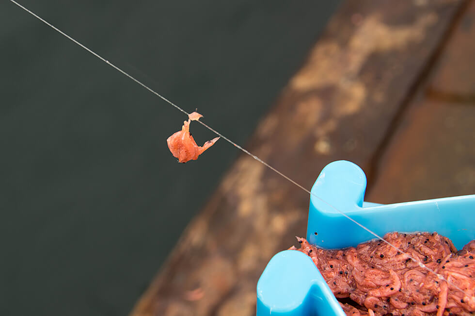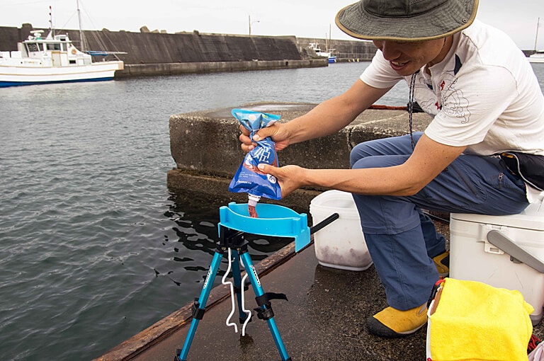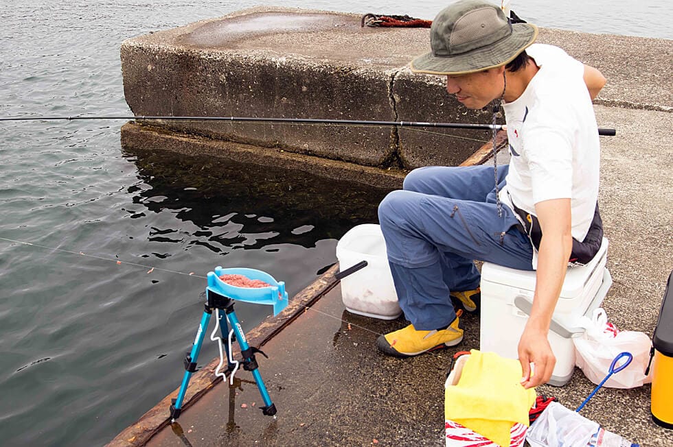 手前の水色の容器が専用の寄せエサ入れ。中に解凍したアミもしくはアミ姫などを入れる