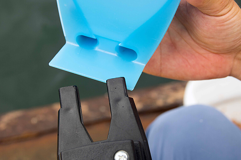 この釣りには専用の寄せエサ入れが必要だ。この寄せエサ入れを投げ釣り用のミニ三脚にセットすると使いやすいが、バケツなどにセットしてもよい。