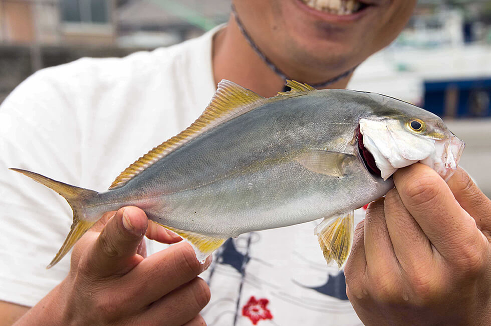 この日、イワシサバのほかにトリックサビキで釣れたのはカンパチの幼魚であるショゴ。他にもいろいろな魚が食いついてくる。
