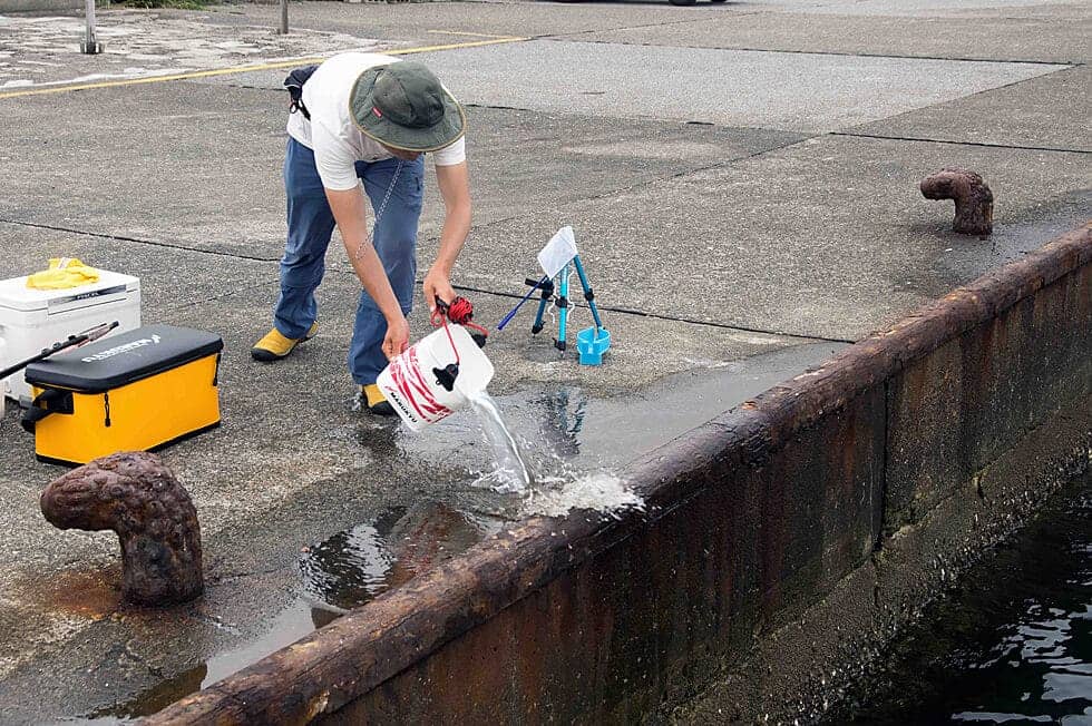 サビキ釣りのようにアミなどのエサを使った釣りのあとは、釣り座の周りに散らばった寄せエサを海水で流して帰るのがマナーだ。