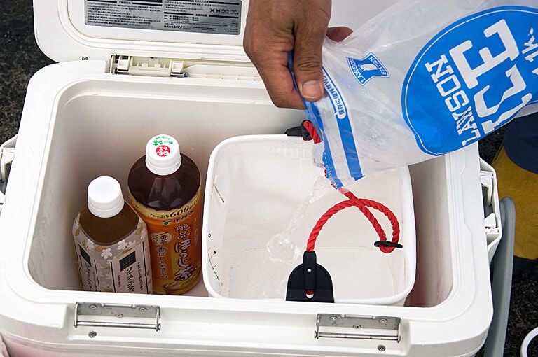 魚を美味しく持ち帰るには「海水氷」を作るとよい。まずクーラーボックス内側にはまる角型の水くみバケツを用意しておき、この容器に氷と海水を入れて海水氷を作る。