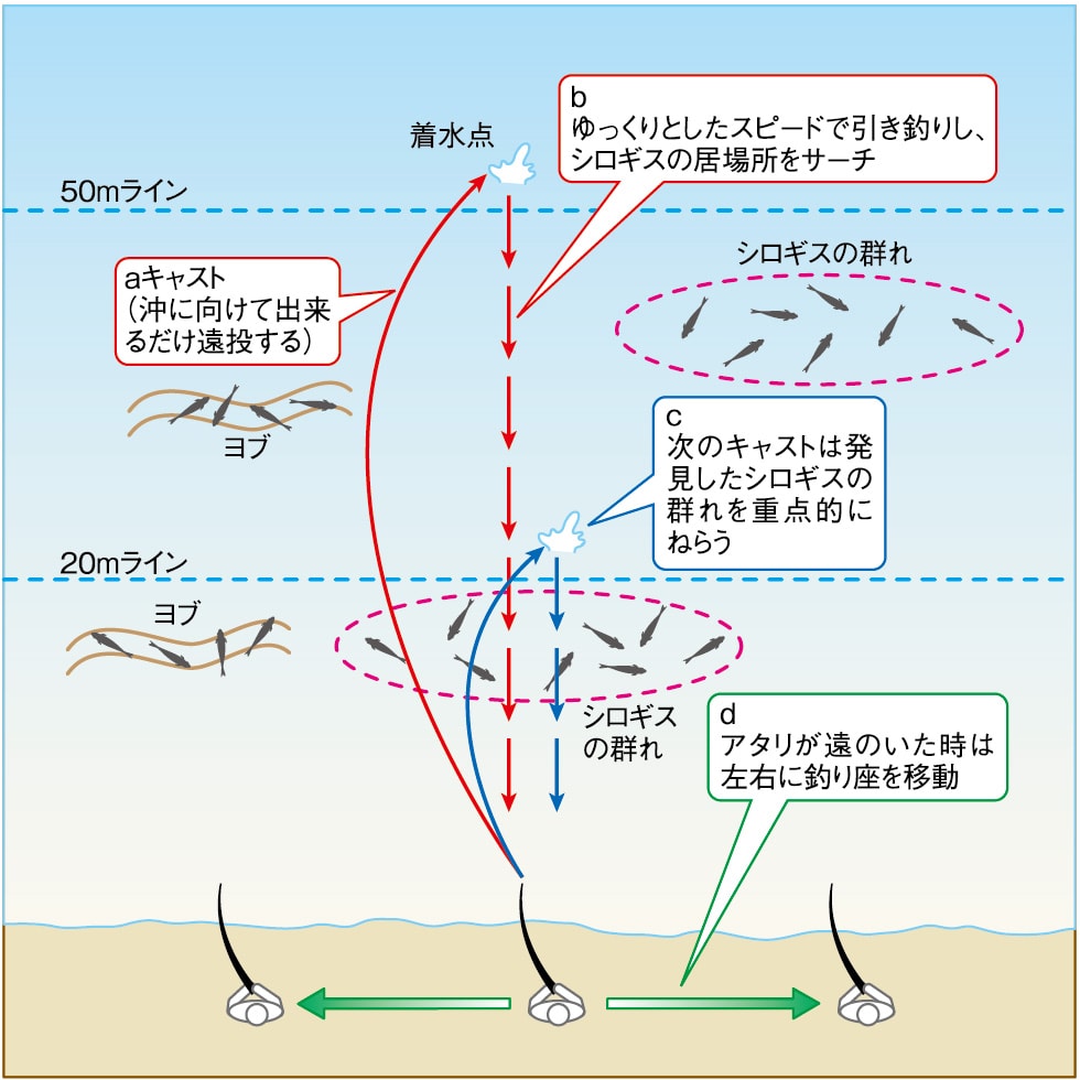 シロギスを仕留める第一歩は、シロギスの群れが波打ち際から何10mくらいの沖合に遊泳しているのか捜し当てること。それには、まず目一杯の遠投を試み、沖合から波打ち際に向かって、仕掛けをゆっくり引きずってくる。それにより、シロギスの居場所をサーチする。