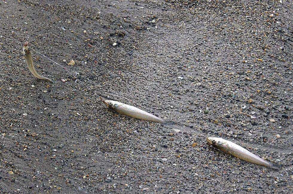 3尾が連掛けとなったシロギス。この時、アタリが出た時のミチイトの色を覚えておく