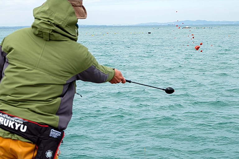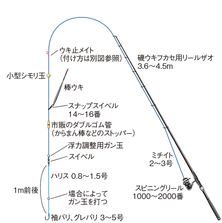 ミチイトを出し入れできるリールザオが適している。とはいっても、無理に遠投するわけではなく、ねらう範囲は足もとか10m以内のニアポイントが中心と考えてよい。