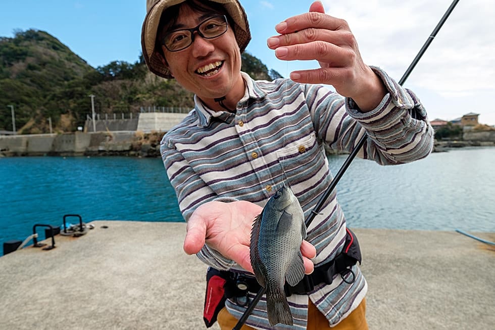 堤防のウキ釣りで人気対象魚の小メジナ。メジナは遊泳力が高く、このサイズでもヒットすると他の魚の数倍の力でグングンと力強くサオ先を引きこむ。ぜひねらってみよう