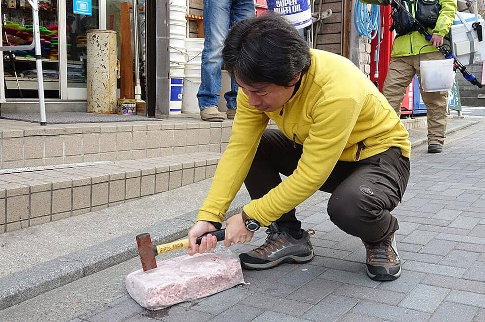 冷凍のオキアミブロックを購入した場合は、店のハンマー等である程度粉砕しておく。ブロックのままだと特にボート上ではなかなか解かすことができないためだ