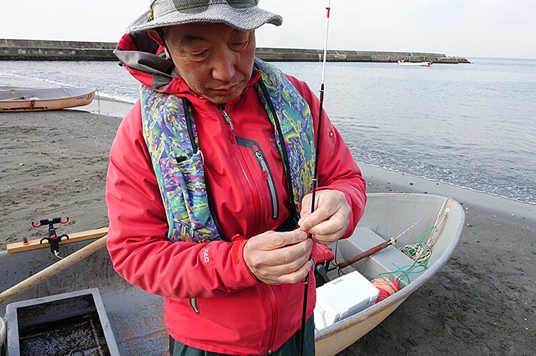 タックルの準備は陸上で済ませておく。海に出てから揺れるボートの上でこの作業を行なうのは大変だからだ。