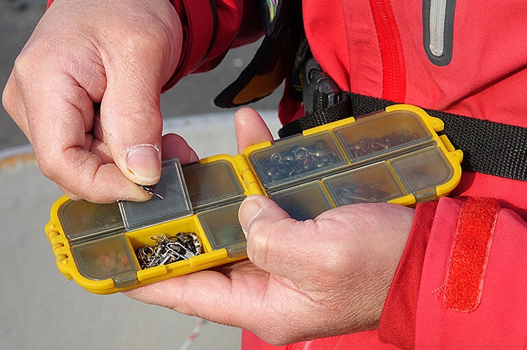 受付を済ませたら着替えをして釣りの準備。日除けの帽子、防寒着、長靴、そしてライフジャケットは必ず着用。海岸まで行きボートに必要な道具を積み込む。快適に釣りをするための荷物の配置も大切だが、サオとリールをセットし、イトの先にスナップ