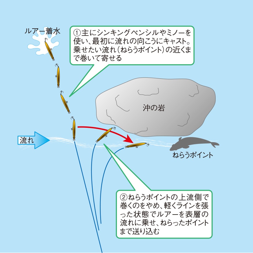 ルアーの操作はタダ巻きをベースに要所で速度変化を織り交ぜるのが基本。そのうえで、さらに数を伸ばすために覚えておきたいテクニックがドリフトだ。ドリフトとは、ラインを緩く張った状態で、流れにルアーを乗せるアプローチである。