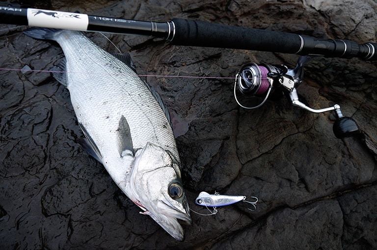 バイブレーションにヒットしたヒラスズキ。荒天時に重宝するルアーだが、ヒラスズキビギナーが使うと状況を問わずヒットを得やすいルアーでもある