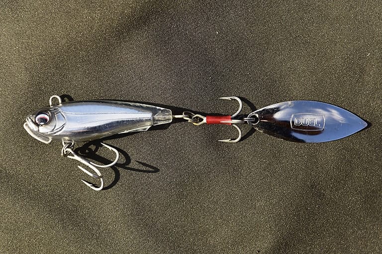 後部に回転翼がついたスピンテールジグも激しく荒れた日に効果的なルアーだ