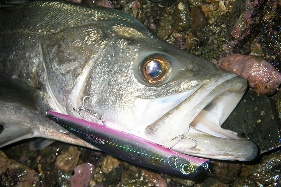 巻き抵抗が変化するスポットを見つけたら、タダ巻きのほかに、こちらからアクションを加えてみるのもよい。具体的にはリーリングスピードを意図的に速めたり、遅くしたり、あるいは止めてみたりする。さらにトゥイッチと呼ばれる、ロッドをチョンと手前に引くアクションを行なう。アクションを加えた水中のルアーには、必ず直後に動きが止まる瞬間が生まれる。これがいわゆる“食わせの間”となり、この時にシーバスがルアーに食いくことがよくある。