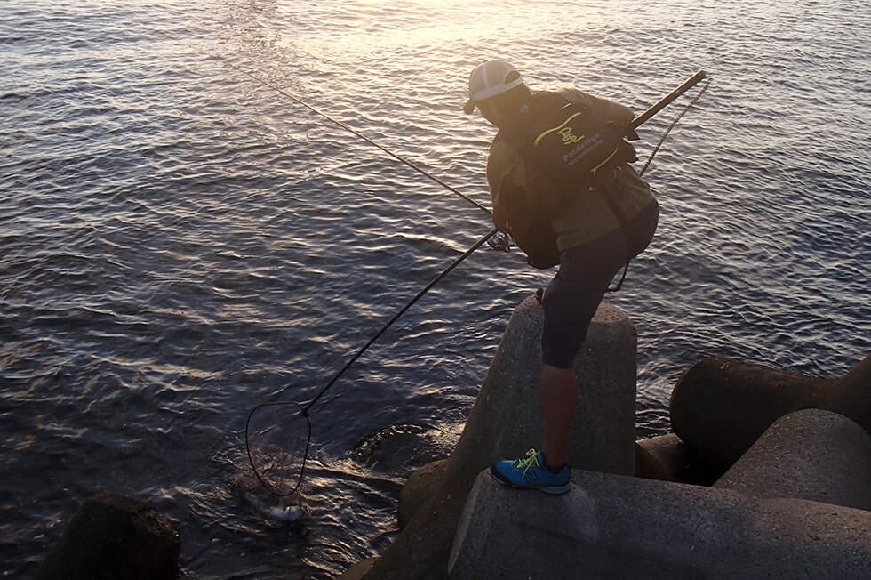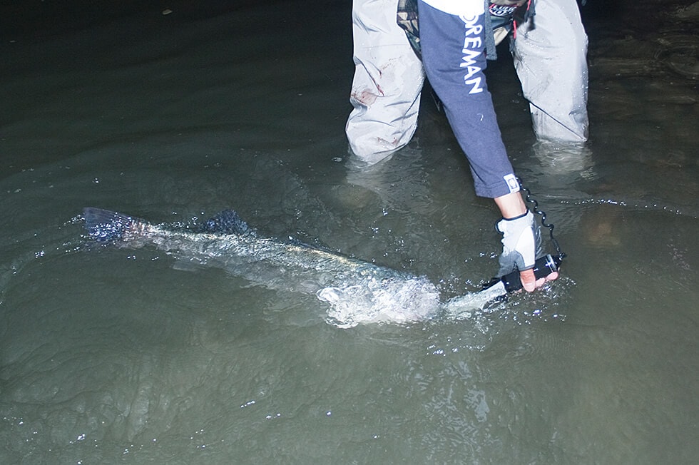 そうして魚を徐々に手前に寄せてきたら、いよいよ最後のランディング。ランディング方法はいろいろあるが、川原のある川なら自分が後ろに下がってそのまま岸にズリ上げる方法が一番確実だ。ただし、護岸で足場が高く魚を引き上げるのが難しかったり、立ち込んでいて岸まで戻るのが難しい場合は、ランディングネットですくうのが確実である。その際は、ルアーの遊びフック(口に掛かっていないほうのフック)がネットに引っ掛からないように魚をよく見て対処しよう。せっかくヒットしたシーバスは、最後まで油断せず確実にキャッチしたい。