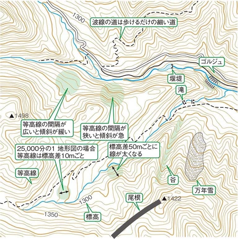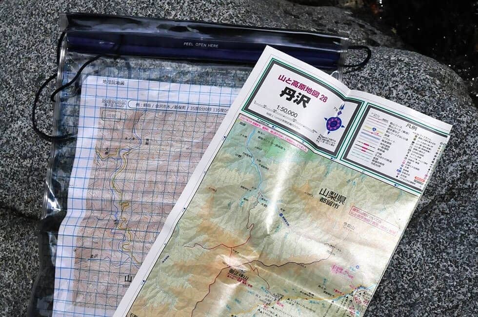 イワナ釣りに限らず、源流釣行で必ず必要になるのが、行き先をカバーした国土地理院発行の「2万5000分の1地形図」だ。紙のものは書店で購入できる。地図上の1cmが250mなので、道程1kmは4cmとなる。なお、近年は電子版がインターネット上で一般公開されており、これをうまくプリントアウトしても活用できる。また、国土地理院地図を利用したスマートフォン向けの地図アプリも充実している。「フィールドアクセス」や「ジオグラフィカ」といったものがあり、有料版のほかに機能に制限があるものの無料版も便利である。これらも大いに活用するとよい。