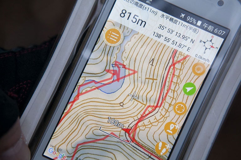 ただし、スマホは山に入ったあとに電池が切れたり、スマホそのものが故障したりするリスクがゼロではない。その時になって手元から地図が完全になくなってしまうというのは非常に危ない。そのため最終的には紙のものを1つ持っておくのが安心だ。なお、スマホのアプリを使う場合は、電波の入るところであらかじめ必要な範囲の地図を閲覧しておき(キャッシュメモリーに地図を入れる)、さらに山の中ではGPSは機能するが電波を拾おうとはしない「機内モード」にあらかじめ切り替えて、スマホの電池の消耗を防ぐ工夫をするとよい。