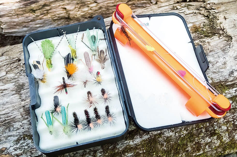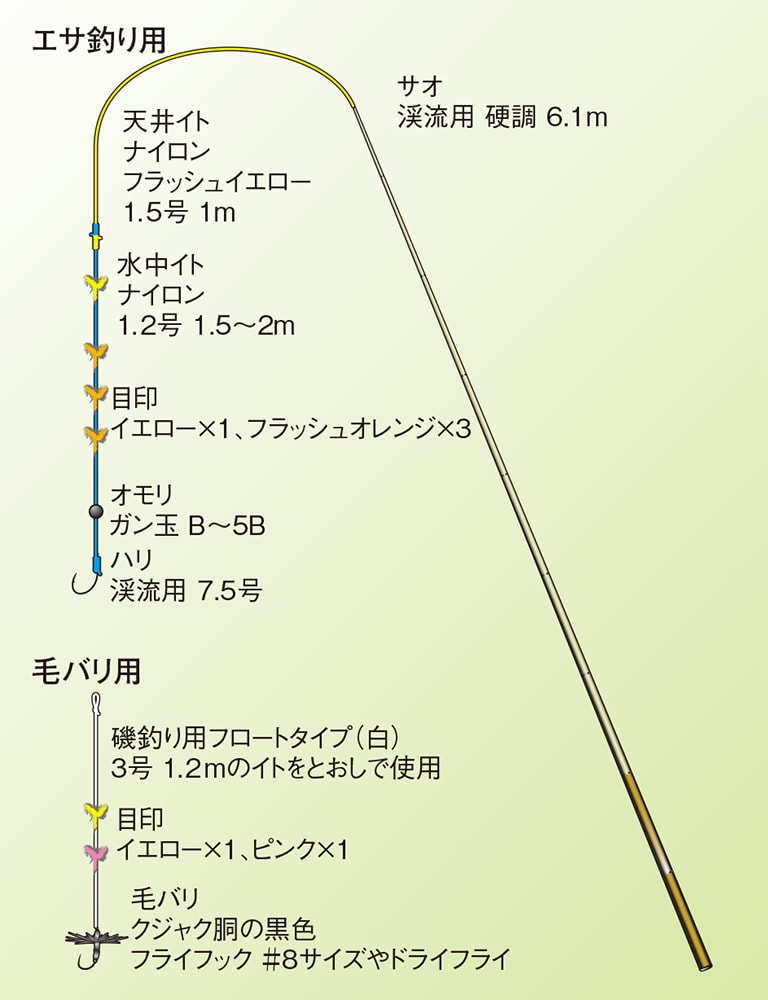 エサ釣りの場合、基本的にはエサは現地で川虫を採取するが、時期によってはその数が少ないこともある。そこで釣具店で購入できるキヂやブドウムシも最低限は用意する。特に急な雨などで川が増水すると、毛バリではなかなか魚が釣れず、さらに川虫も採取できないケースがよく起きる。そんな時は用意しておいたキヂやブドウムシを使ったエサ釣りが無難だ。