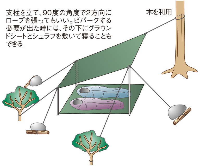 雨などが溜まらないよう、斜めにするのは一般的な張り方のひとつ。高いほうは木などを利用してもいいし、地形的に高くなった場所にロープを張ってもいい。支柱を立てるのも手だ