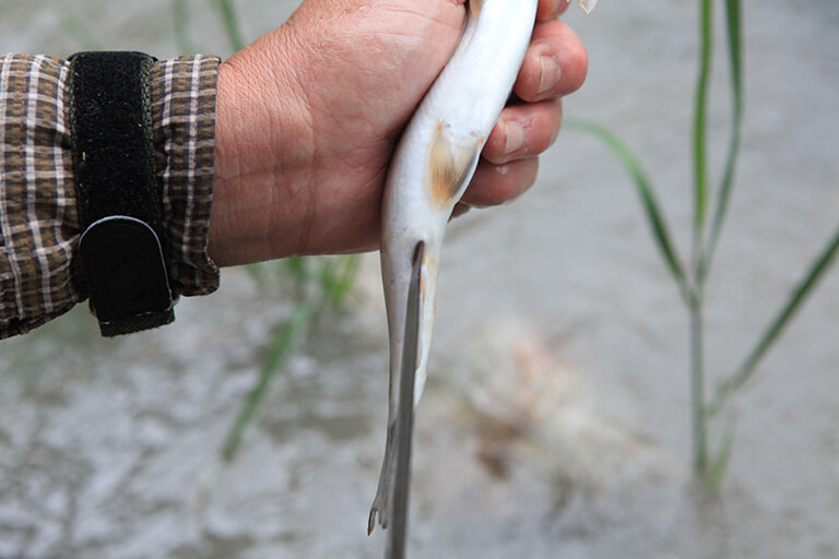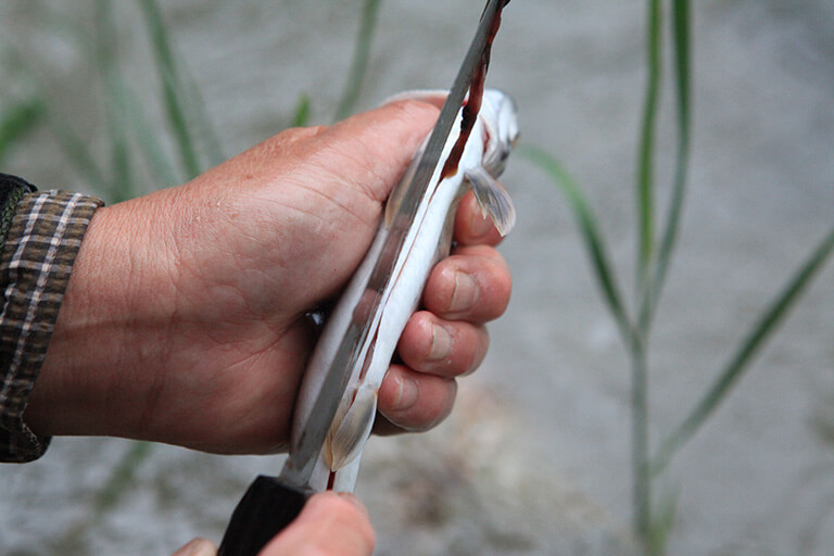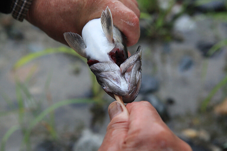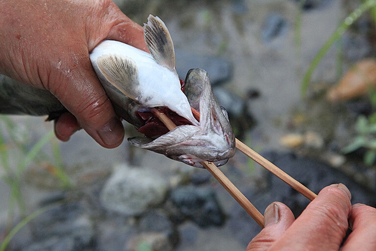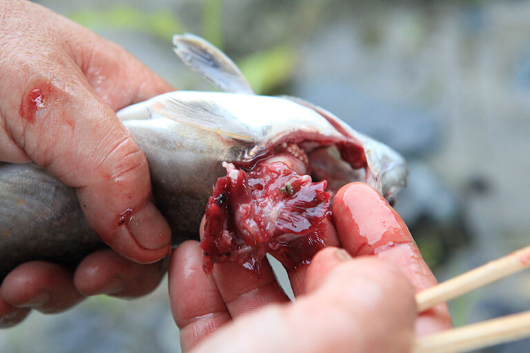 釣りあげたイワナを食べる場合は、早めにエラや内臓を取り出す下処理をする。おすすめの方法は、まず割り箸を口から入れ、エラを押さえて腹の中まで通す。両側を同じようにやったら、魚を軽く握って割り箸をスクリュー状に捻り回すとエラが本体から外れる