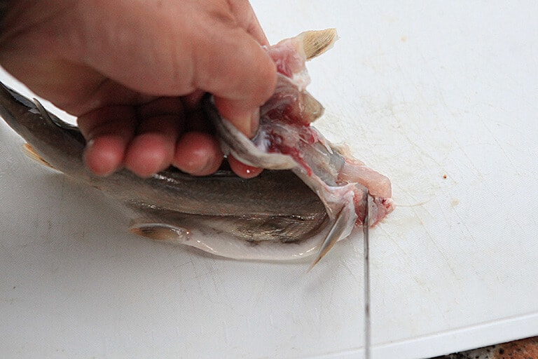 ナイフを肛門から入れて腹を裂き、内臓をエラと一緒に取り出したら、腹の中の中骨に付いている血合いを指でこそぎながらきれいに落とし、最後に全体を濡れた手拭いなどできれいに拭く。水で洗わないほうが味が落ちない
