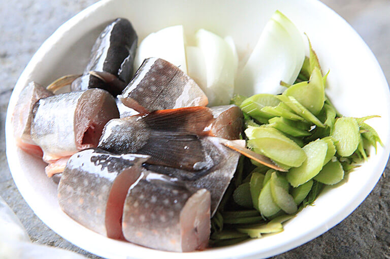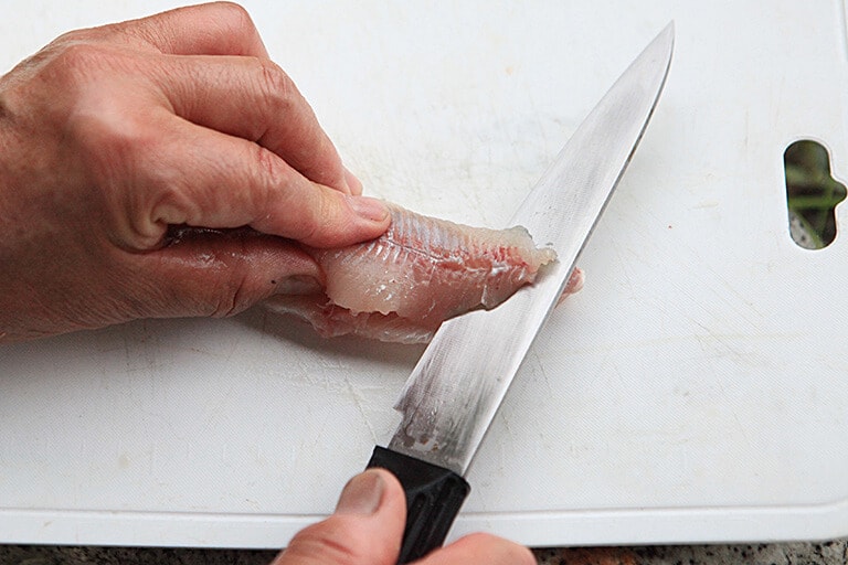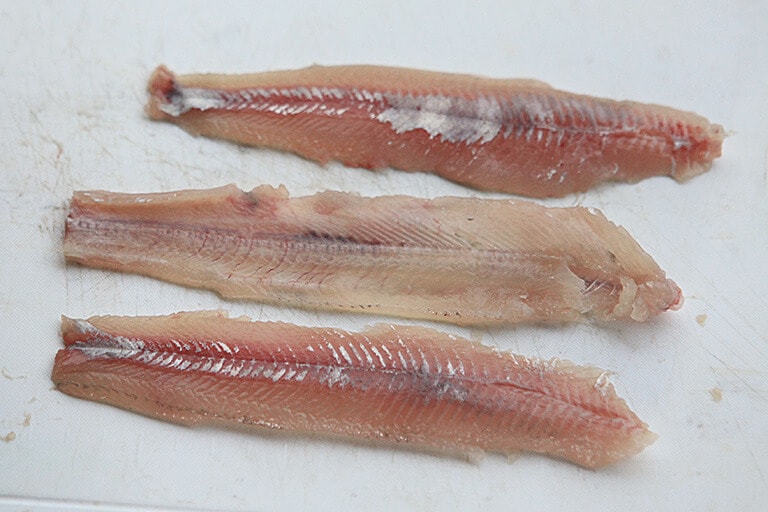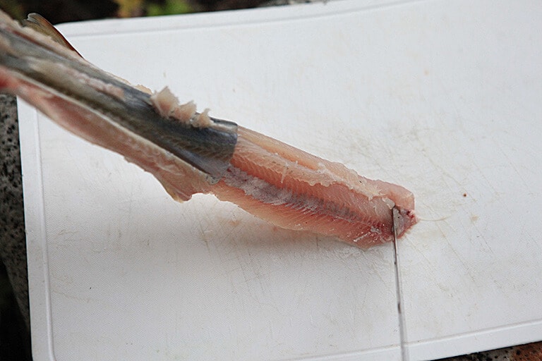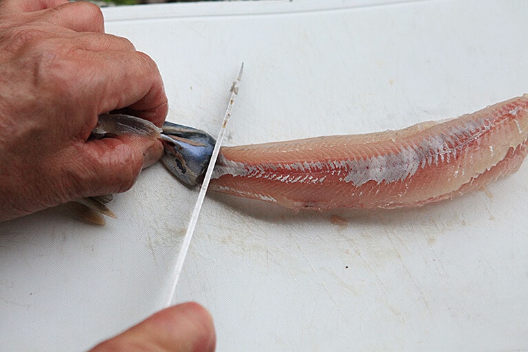 腹側を下にして伏せるように置き、頭を背中にくっ付けるように反り返すと中骨が折れるので、そのまま胴体の中骨の端をナイフの背でしっかり押さえる。次に中骨を押さえながら、頭をしっかり持って引くと、皮がすっぽり剥けるので、最後に尾ビレの付け根にナイフを入れ本体から切り離す