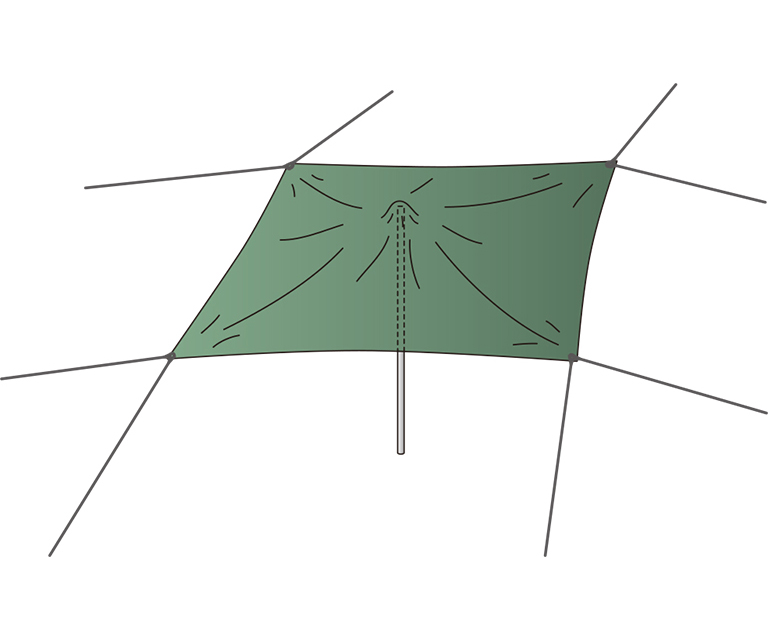 中心に支柱を立てて、雨水が溜まらないようにする方法もある。この場合はタープが傷つかないように、支柱にタオルなどを巻くか、枝葉の付いた枝を利用する