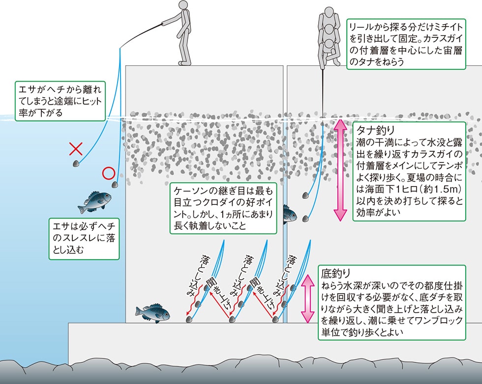 タナ釣りでは、帯状に付着しているカラスガイの層を中心にした「潮間帯(高潮線と低潮線の間にできる帯状の部分)」をポイントに定める。カラスガイは満潮の時には潮をかぶり、干潮になると露出するような位置に多く付着するためだ。また、いずれの釣り方をする場合でも、釣りをする際はむやみに体を外に乗り出さず、ヘチから一歩下がって、サオ先を岸壁沿いに下ろすようにする。それによりクロダイに警戒されにくくなり、また壁際ギリギリにエサを落とす操作もやりやすくなる。