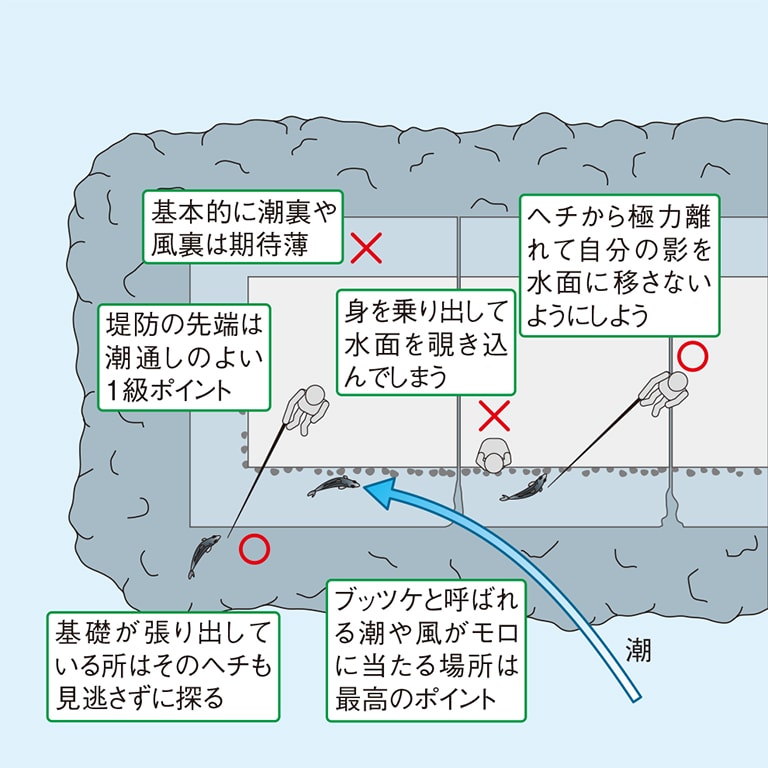 この釣りでは「ヘチ釣り」と呼ばれる、岸壁に沿ってギリギリを釣っていくスタイルが基本になる。そのうえで、ヘチ釣りには宙層ねらいの「タナ釣り」と、底の周りをねらう「底釣り」の2とおりの探り方がある。どちらもミチイトは必要な長さだけをリールから出したら固定し、あとは岸壁に沿って上下させる操作を繰り返すのは同じだ。