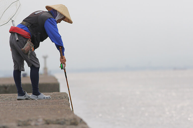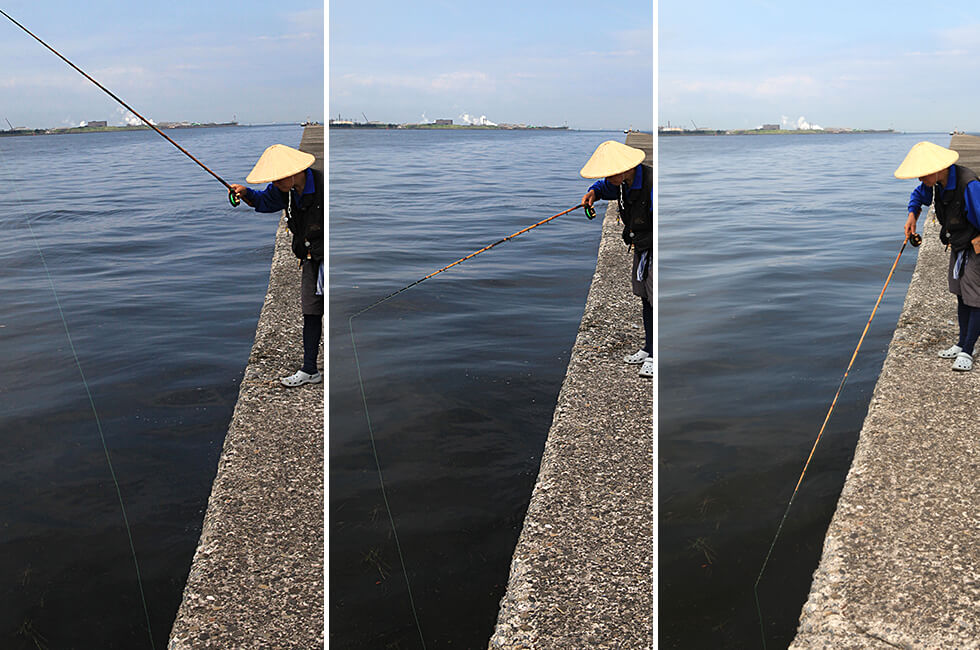 釣り方はシンプル。リールから一定の長さのミチイトを出したら、あとは岸壁スレスレにエサが落下するよう、仕掛けを上げては落とし込む動作を繰り返す