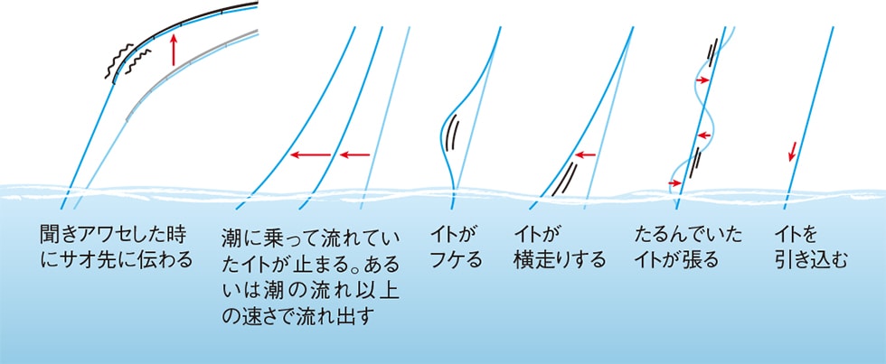 この釣りのアタリはミチイトの変化でキャッチする。そのバリエーションは実にさまざまだが、その千差万別さこそがこの釣りをより面白いものにしてくれている。それらの中でも代表的なパターンは以下のようなものだ。