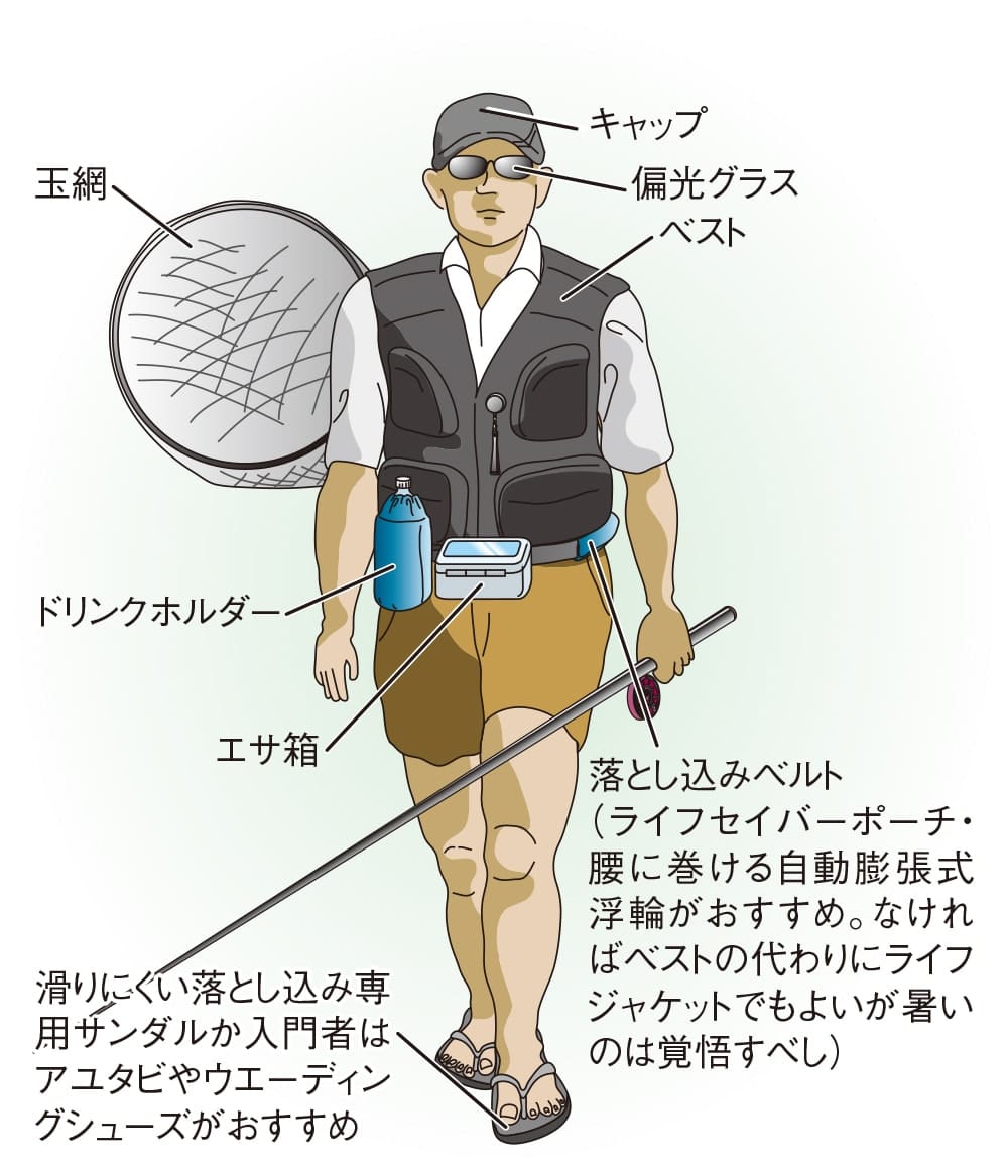 シューズやアユタビの着用がおすすめ。また、堤防は日陰がないので帽子は必需品。風通しのよい菅笠や麦わら帽子も愛用者が多い。