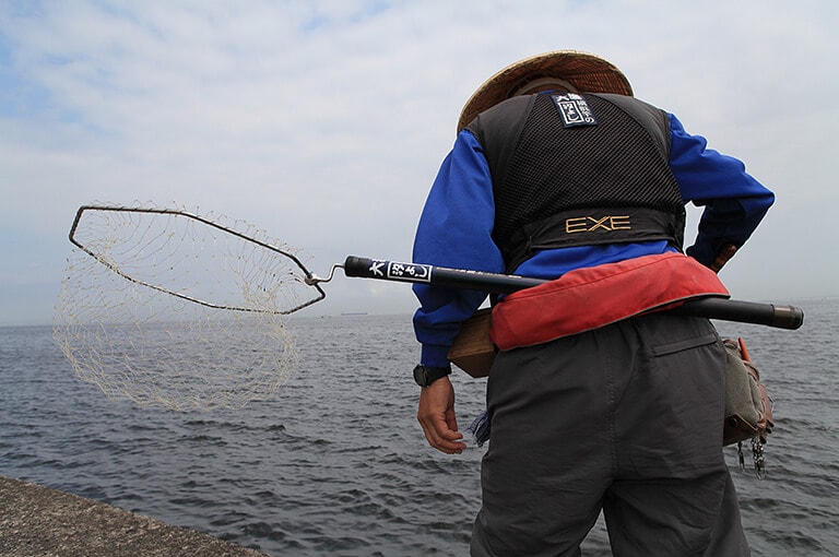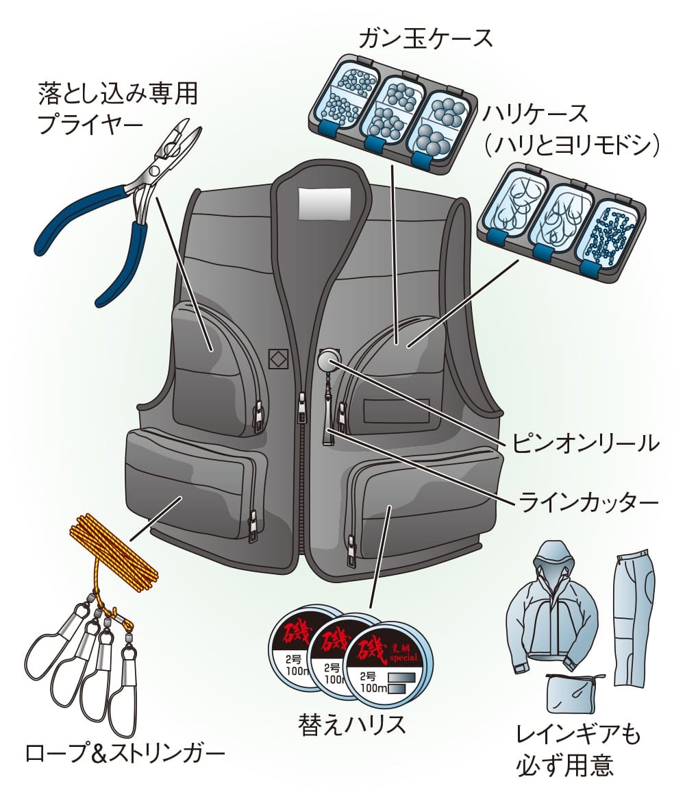 は必需品のひとつ。長さは堤防の高さに応じて用意するが、東京湾の沖堤であれば5.3mあれば問題ない。枠径は45~50cmが適当である。また、万一の落水に備えてライフベストは必ず着用する。カラスガイやカニなどのエサは、ロープと網ブタの付いた生かしバケツに入れる。ロープの端を固定しバケツを海面下に沈めておけば鮮度を保てる。エサは鮮度のよいものを小出しにして使うのだが、機動力を高めるためにベルトに装着できるエサ箱を携帯したい。足もとはフェルト底の