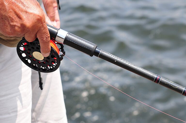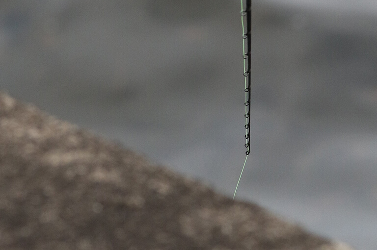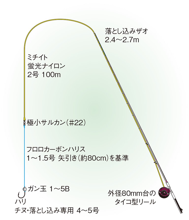 を取る。そのため、視認性の高いミチイトが必要不可欠で、蛍光グリーンなどの色付きのナイロンを使う。太さは2号が標準。遠投する釣りではないため、リールには50~100m巻いておけばよい。