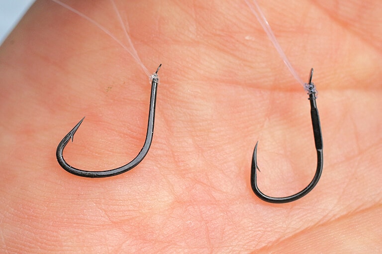 やユニノットを使う。ハリはエサがカラスガイの時はチヌバリの2~4号(右)。カニの時はカイズバリの12~14号(左)が早坂さんのおすすめ。ハリの形状がエサに合っているとスムーズに釣りができる。