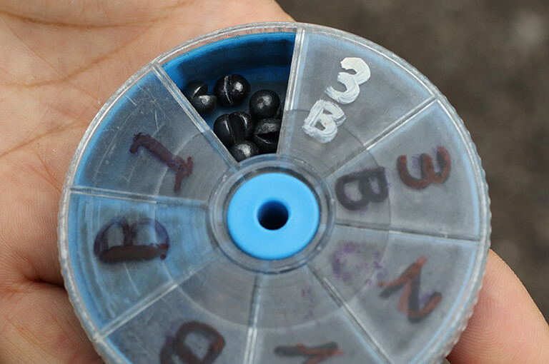 の1号、B、2B、3B、4B、5Bを準備しておけば間に合い、主に潮の速さによって使い分ける。潮が速ければ仕掛けを安定させるため重くし、そうでなければナチュラルにエサが落ちるように軽めを使う。