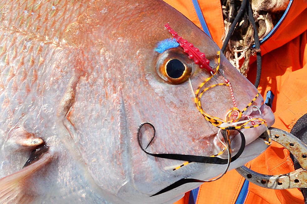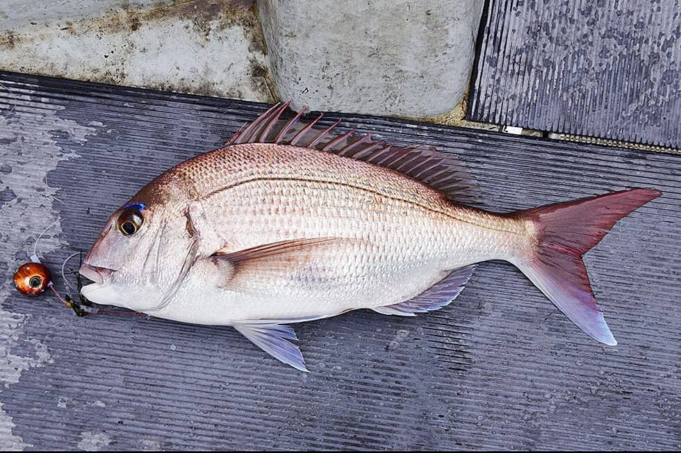 深紅の魚体に、鮮やかな青色の斑点とアイシャドーを持つマダイ。全国に広く分布し、エサ釣りからルアーフィッシングまで、さまざまな釣り方の対象魚になっている。産卵期は春で、水温が低い時期は100m前後の深いところにいるが、水温の上昇とともに30〜40m、あるいはもっと浅いところにも入ってくる。沖合、堤防、磯やサーフ(砂浜や砂利浜)といろいろな場所からねらえるが、今回のタイラバは沖合での船釣りが前提。エサはエビやカニなどの甲殻類が好物だが、ほかにもイワシをはじめとする小魚、タコやコイカ、イソギンチャクといった軟体生物、ユムシなどのムシ類を食べるなど、幅広い食性を備えている。