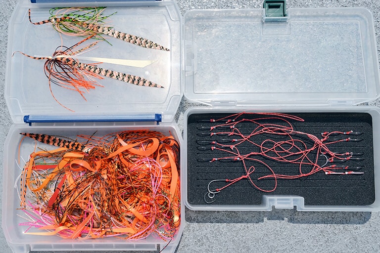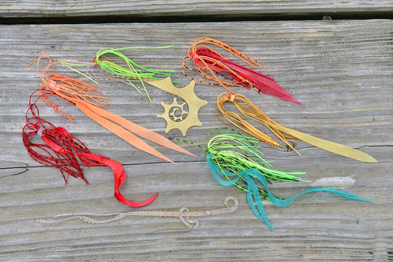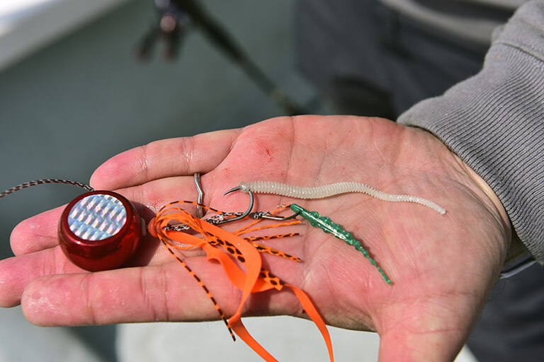 この他、最近は軟らかい素材でできたワームも人気を博している。ワームをスカートやネクタイと一緒にまとめたり、ハリ先にセットするだけでボリューム感を増すことができ、それにより釣果を得られることがよくある。釣れない時はワームも試してみよう。