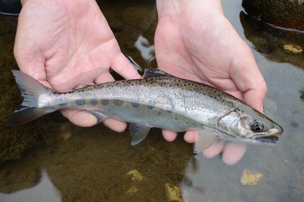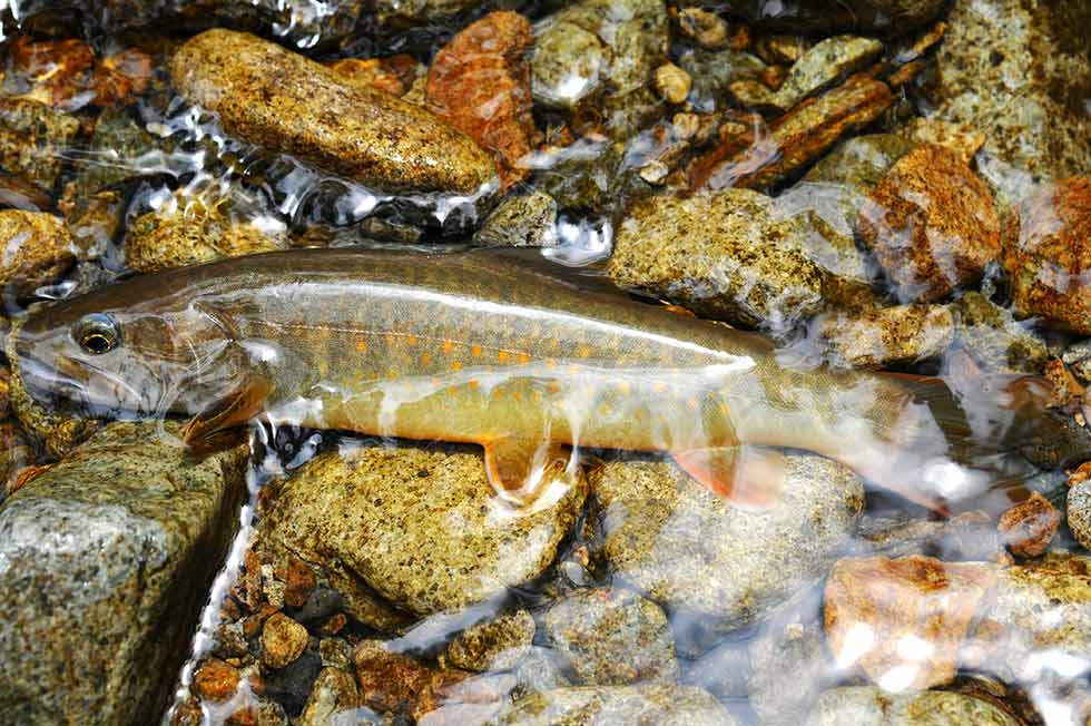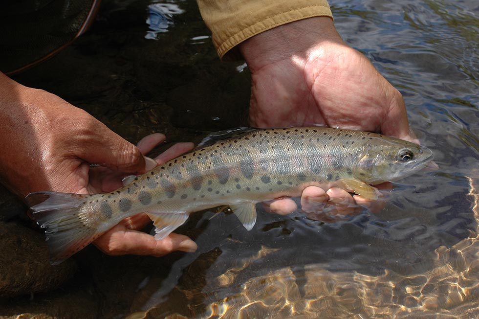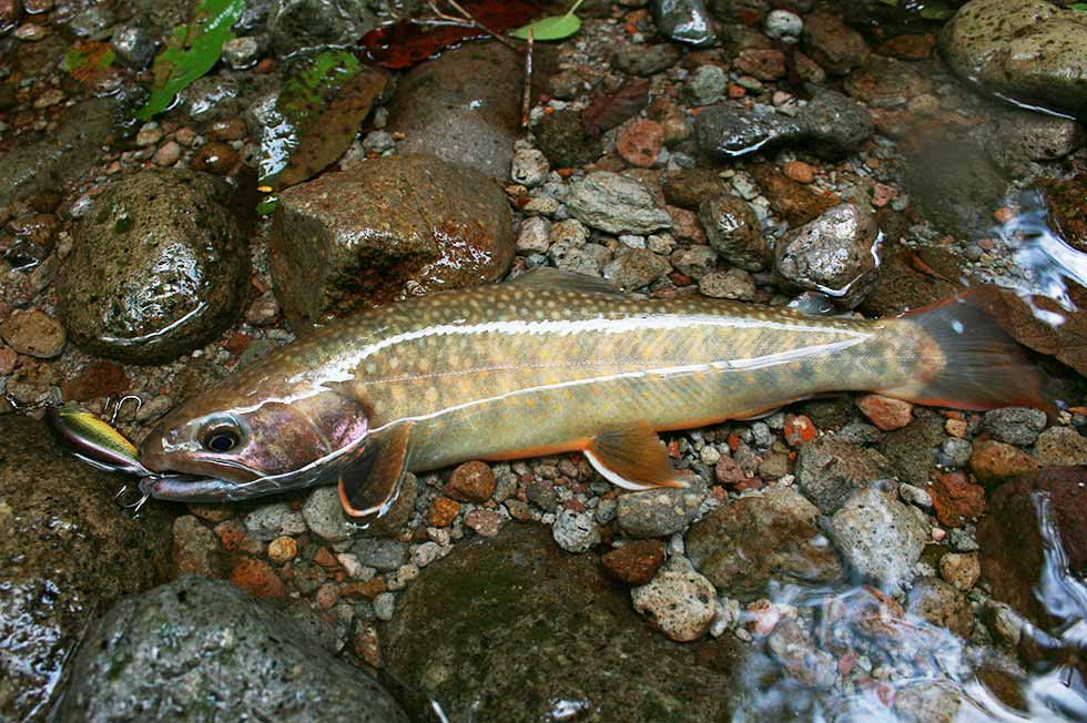 中部地方に多いヤマトイワナは明瞭な斑紋が少なく、どことなく原始的な風貌をしている