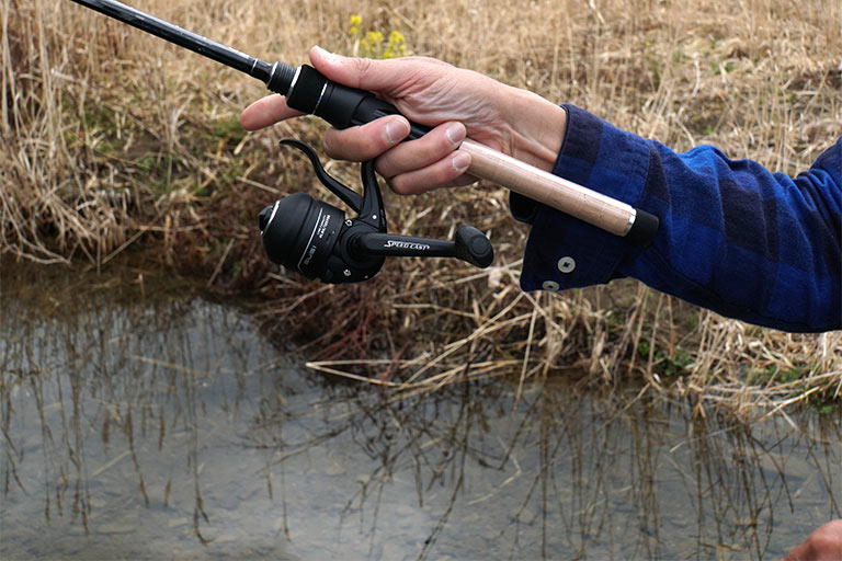 利き手と反対側からキャストする時は、写真のようにタラシを長く取り(ロッド1本分弱)、ルアーを手に持った状態から始める「振り子投げ」がおすすめ。