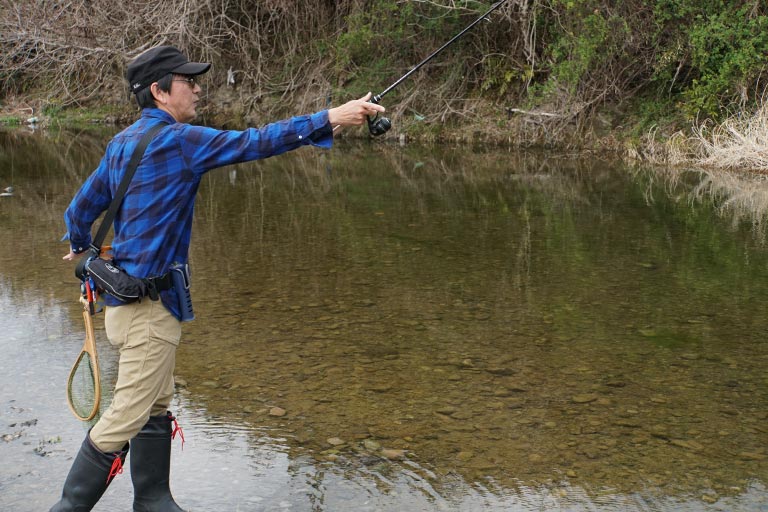 オープンなスペースで利き手側からキャストする場合は、通常のオーバーヘッドキャストやサイドキャストでよい。その時のタラシは短め(20cm)にする。