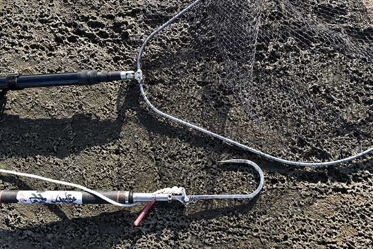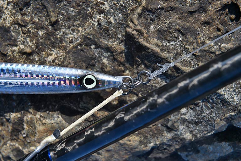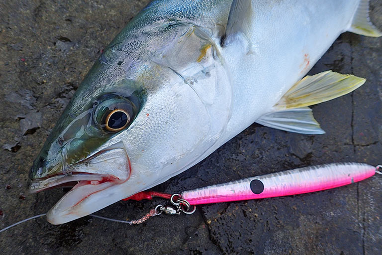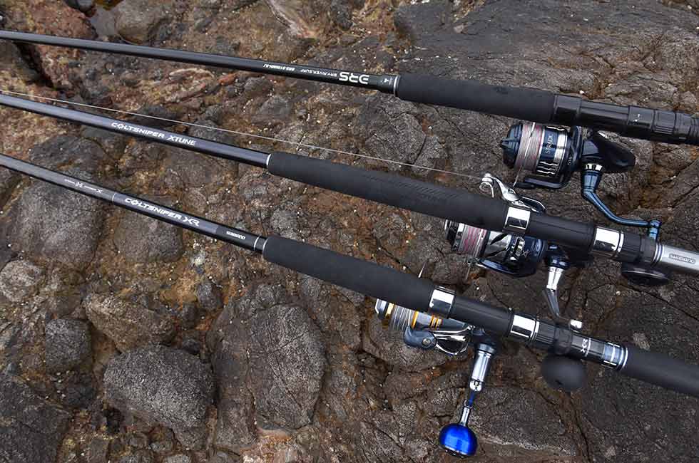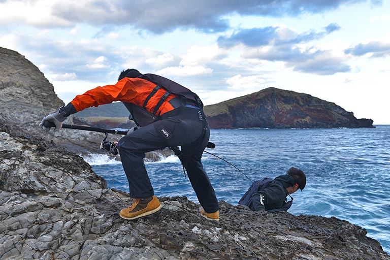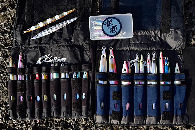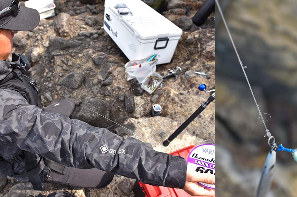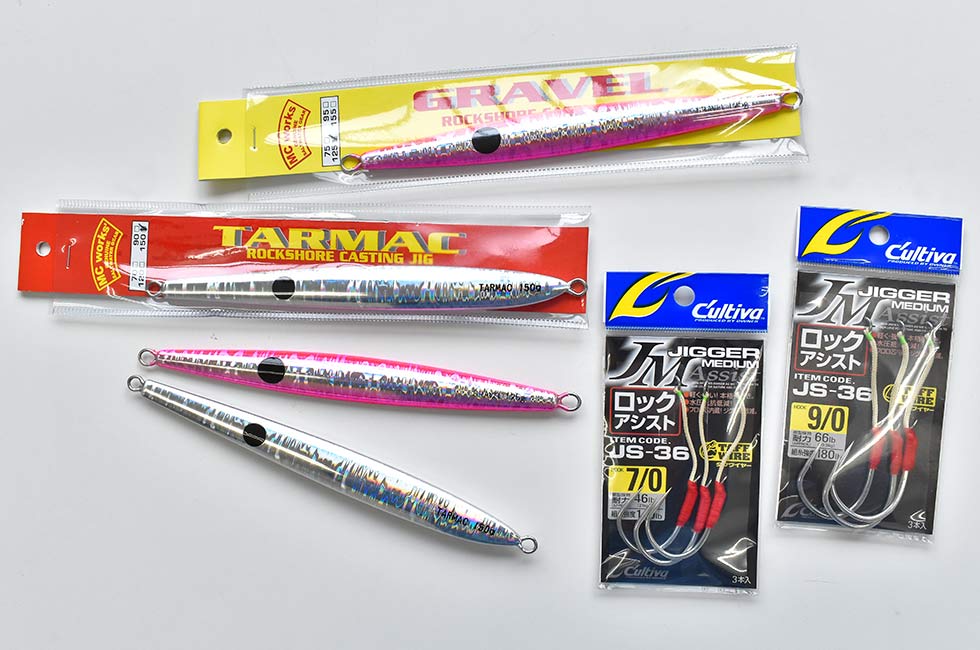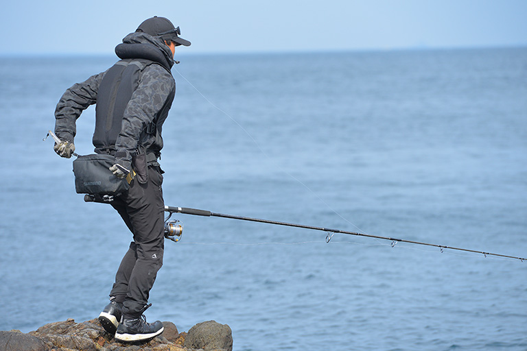 青物や大型魚を磯からねらう本格的なショアジギングでは、サオがショアジギング用の10ft前後、リールは8000番前後、イトはPE3〜5号、リーダーはフロロ60〜80Lbを4〜5mが標準的なタックル。そのほかに釣り場で安全を確保するライフジャケットやスパイクシューズが必須アイテムになる。タックルは頑丈で長さと重さがあるので、一回一回しっかりキャストするには、腕や腹部の周りをスッキリさせておく。予備のルアーは邪魔にならないところに身につけるか、小さなバッグに分けて携行する人が多い。
