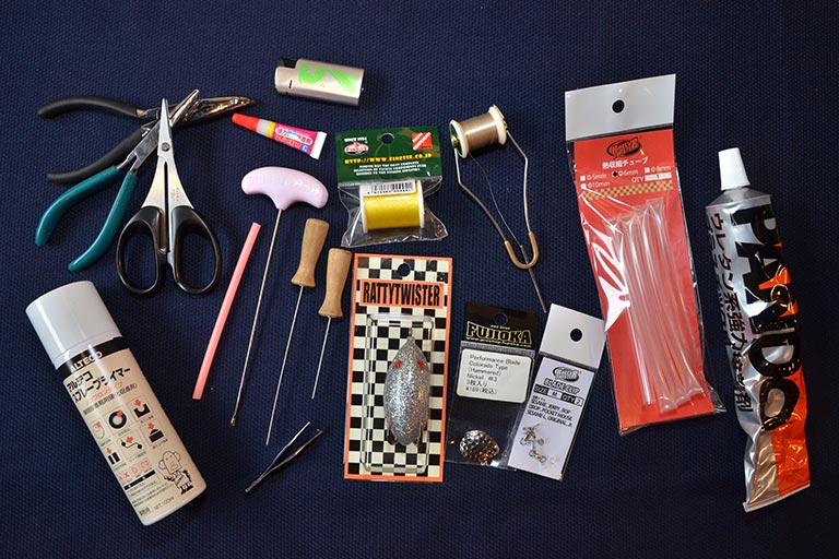 雷魚釣りはフロッグのチューニングから始まる。雷魚釣りに対応するメーカーからさまざまな形状のフロッグが販売されているが、基本的な構造はどれも同じ。まずは気に入ったデザインのものでやってみればよい。工具以外のアイテムは、雷魚釣りのコーナーがある釣具店や専用ショップで手に入る。