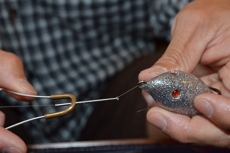 雷魚がフロッグをくわえた際にボディー内部からスムーズに空気が抜ける穴を開ける。ライターで熱したニードルをフロッグの尻に当てて差し込むだけ。なお、尻に開けるのが一般的だが、浸水しなければどこに開けてもよい