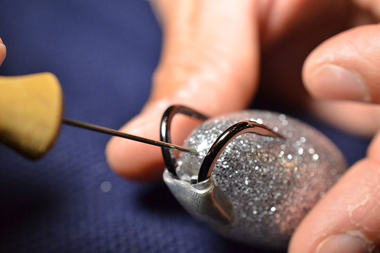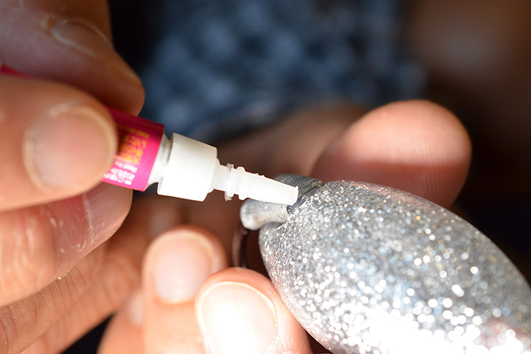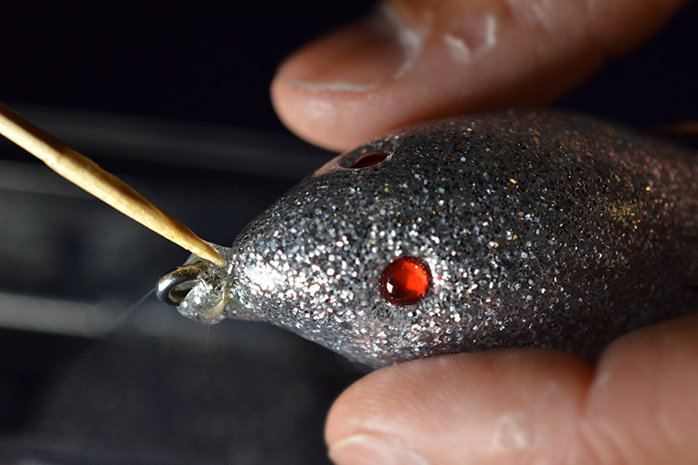 そこからフックホールの隙間をシーリング剤で埋めていく。一度塗りでは被膜が薄いので、最低でも3回は重ね塗りする。その際、スレッドを巻いた口の部分もシーリング剤を塗る。爪楊枝でシーリング剤をかき混ぜ、少し置いておくと粘度が高まって作業がやりやすい。最大のコツは焦らないこと。乾いたらダンゴの完成