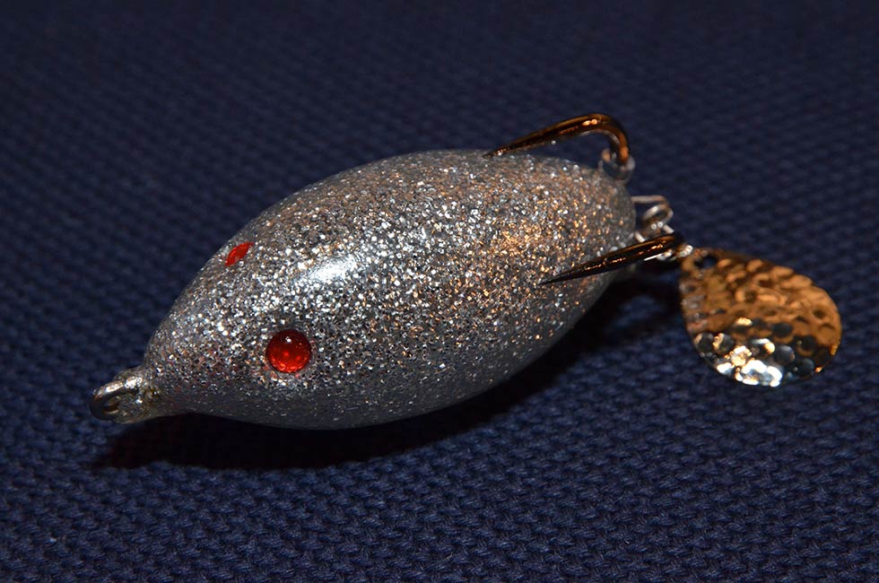 ウェイトの位置を調整し、ルアー内部への水の浸水を防ぐシーリングをして、魚にアピールするブレードを追加で取り付けた状態のフロッグ。このような調整を自分のアイデアで行なう