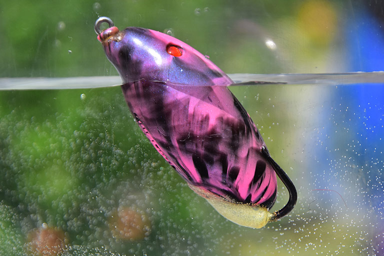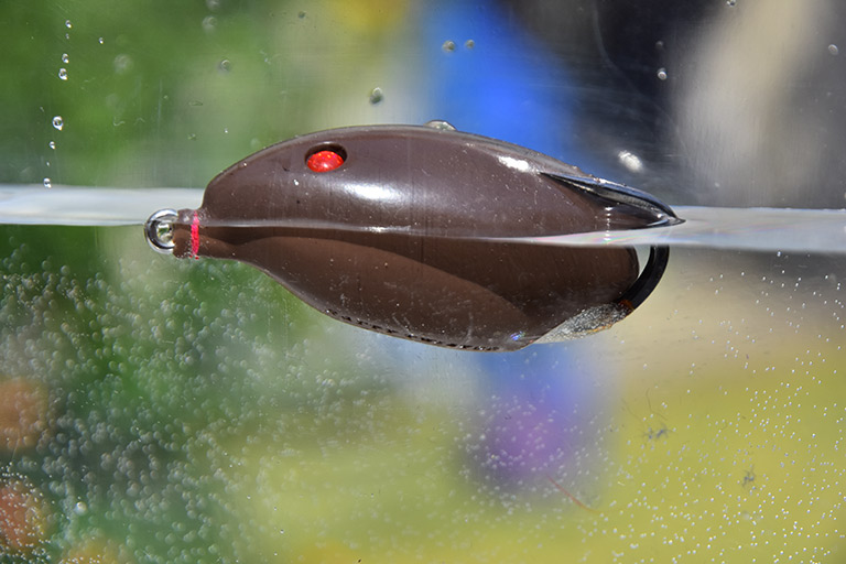 ウェイトの位置により釣りをするフロッグの浮き方が変わる。作業中はアクリル水槽に浮かべて浮き角度や姿勢をチェック。このような「横浮き」に仕上げると、水面を滑るように艶めかしくアクションする