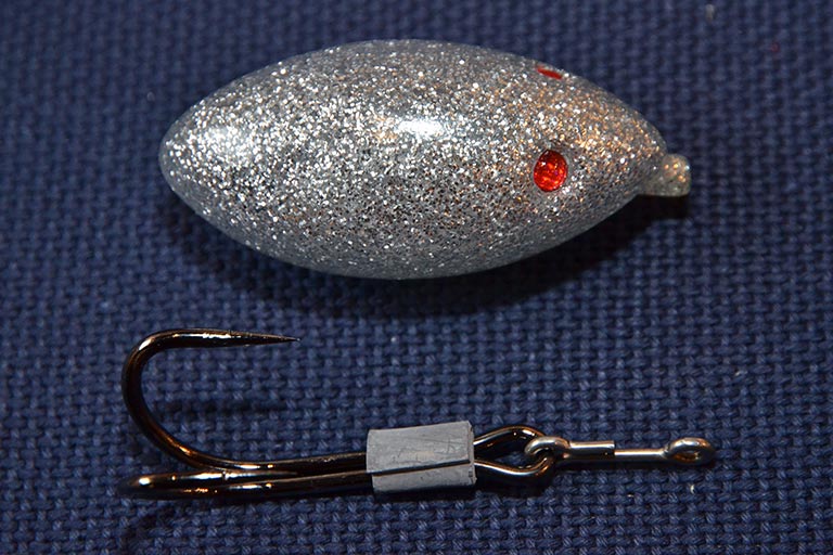 フロッグの中はこのようになっており、フックシャンクに巻かれた板オモリの位置を調整することで姿勢を変えられる(写真は購入したままでウェイト位置調整をしていない状態)。作業する際は、まずボディーを裂かないよう慎重にフックとアイを引き抜いたら、あとは自分好みの浮き角度をイメージしてオモリの位置を決めて固定する。フロッグのボディーからフックとアイを抜く時は、フロッグの口を破らないようお湯で温めてから抜くとスムーズ