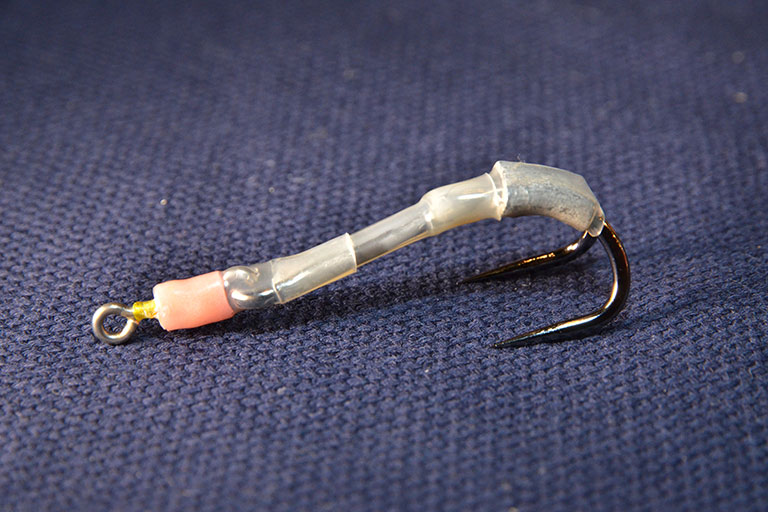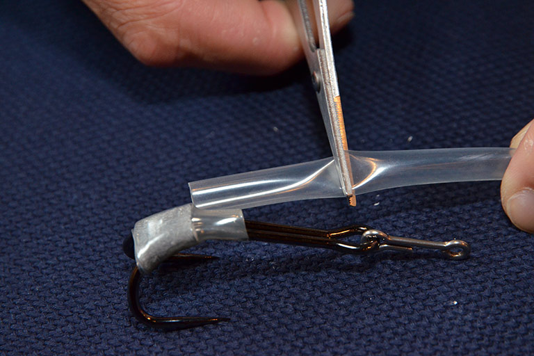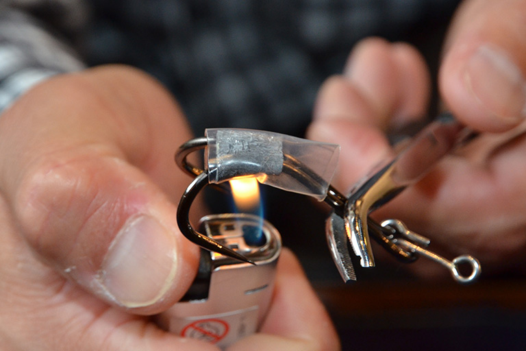 さらに別にカットした収縮チューブをフックに被せて再びライターであぶり、ウェイトの位置を完全に固定する