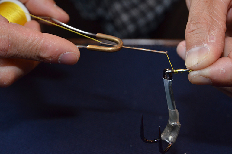 フックアイはそのままだとやり取りの最中に開いてしまう可能性があるのでスレッド(糸)で補強する。スレッドはフックアイの下部に結んで締め込み、下から上、上から下と折り返して二重に巻いたら、最後は2回のハーフヒッチで巻き留め、ほどけないように端をライターであぶってコブを作る。その後、スレッド部分には液状タイプの瞬間接着剤を染み込ませて、硬化促進剤のプライマースプレーを吹き付けておく