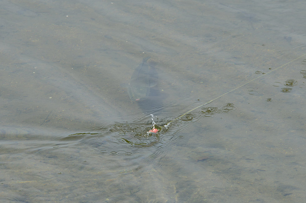 用水路で釣りをする時は、自分の影が水面に落ちると気配を悟られやすいのでロングキャストが基本。手早くチェックしていく場合は、太陽を背に受ける側に立って、足もとのシェード(陰になっている部分)を探っていく。ヤル気のある雷魚が潜んでいれば、激しい捕食音とともにフロッグが水中に消える。また、雷魚がフロッグを追尾してきたら、一定の距離を保ちながらトゥイッチを入れて煽っていく。雷魚が興奮して魚体をうねらせたら、タイミングを見計らってポーズを入れて食わせよう。